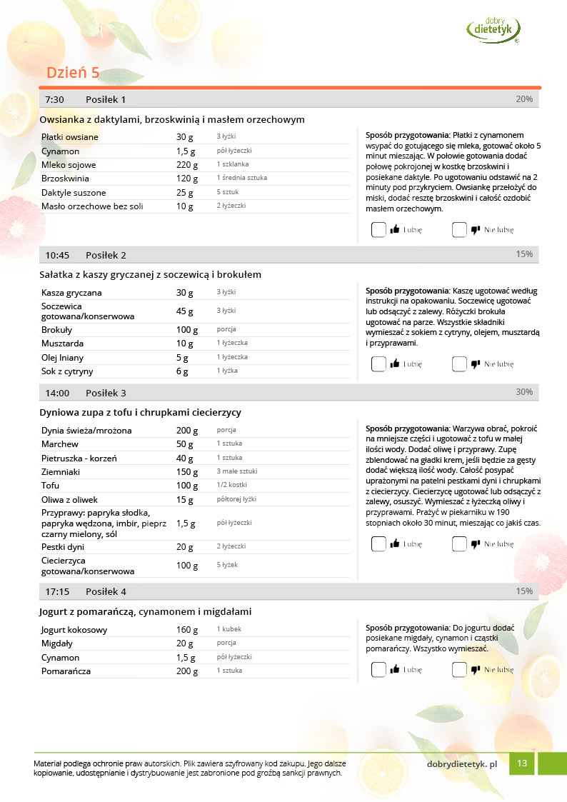 • Liczba posiłków w ciągu dnia: 5
