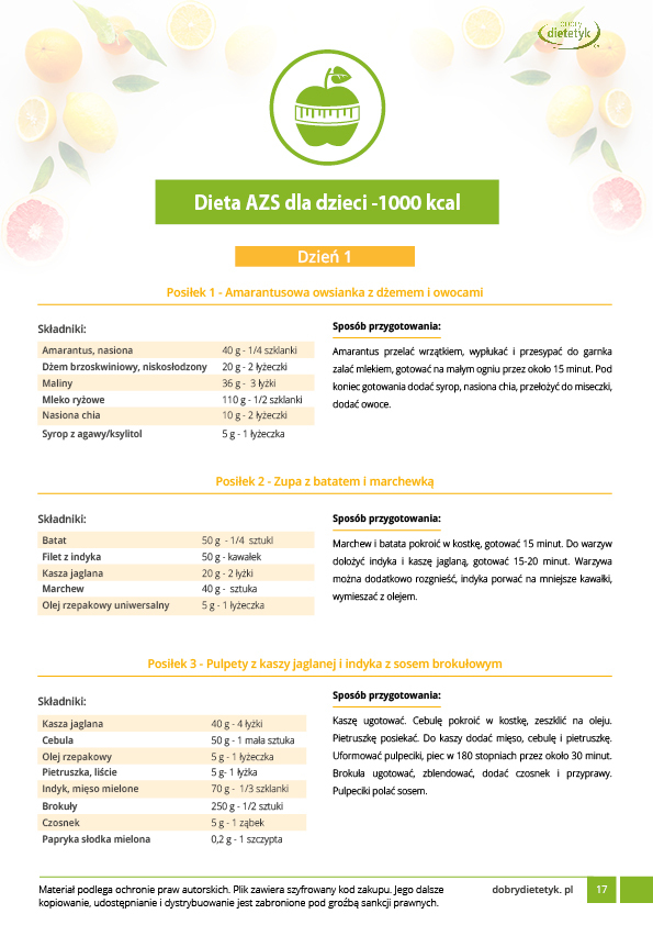 Opracowanie zawiera zbiór niezwykle ważnych informacji dla osób borykających się z atopowym zapaleniem skóry. Dodatkowo przygotowano dwa 7-dniowe jadłospisy dla dzieci i osób dorosłych. Program dietetyczny został opracowany przez zespół dietetyków specjalizujących się w leczeniu żywieniowym chorób skóry. W diecie zadbano o najważniejsze potrzeby żywieniowe z jednoczesnym ograniczeniem produktów zaostrzających AZS.