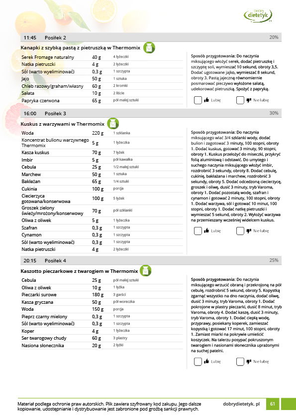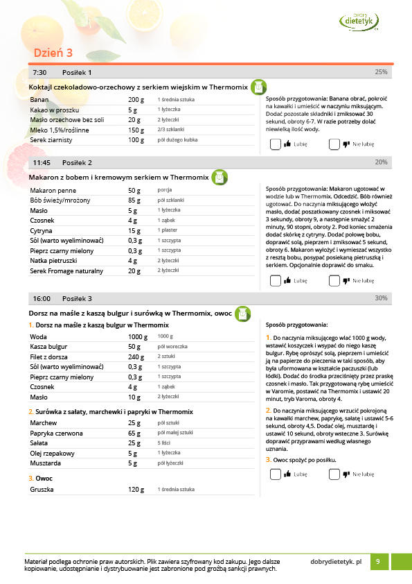 Kompleksowy 30-dniowy program redukcyjny dla mężczyzn uwzględniający w przewadze dania na THERMOMIX. Program zawiera szczegółowy, 30-dniowy jadłospis na 1800kcal uwzględniający 4 posiłki w ciągu dnia.  Program realizuje potrzeby odżywcze organizmu mężczyzn a także wymagania związane z najczęściej występującymi wymaganiami zdrowotnymi (regulacja ciśnienia krwi, wspomaganie pracy serca i układu krążenia, regulacja hormonalna). W opracowaniu tej diety uwzględniono dużą ilość posiłków na  Thermomix co ma ułatwić stosowanie planu żywieniowego panom posiadającym tego typu urządzenie. Dania na Thermomix zamieszczone w tym opracowaniu nie zawierają typowych przepisów jakie można znaleźć w internecie. Są to dania specjalnie opracowane lub zmodyfikowane pod kątem diety redukcyjnej. Wszystkie porcje są również podawane w przeliczeniu na jedną osobę. Stosowanie tej diety nie tylko przyczyni się do szybkich efektów w redukcji masy ciała, ale także pozwoli poznać nowe, pyszne przepisy na Thermomix.