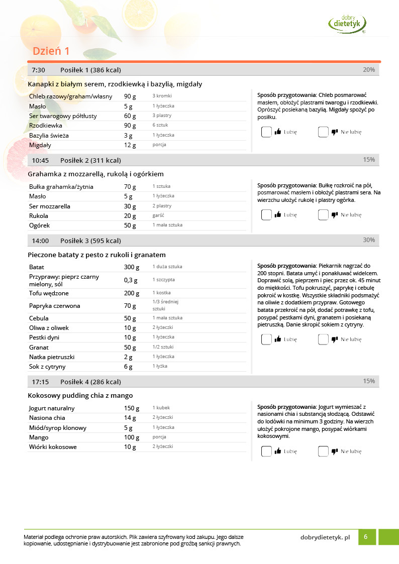 • w formie precyzyjnych jadłospisów wielodniowych (na każdy dzień miesiąca jest opracowany osobny jadłospis). Tutaj nie musisz zastanawiać się co zjeść każdego dnia, gdyż będziesz mieć dokładnie wszystko rozplanowane.