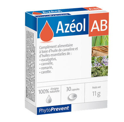 Azeol AB jest suplementem diety opracowanym na bazie oleju z lnicznika siewnego (Camelia sativa) i specjalnej kompozycji olejków eterycznych z eukaliptusa, cynamonu, rozmarynu i nasion marchwi. Zastosowany w produkcji, opatentowany proces Quality Silver, gwarantuje maksymalną jakość i trwałość oleju w okresie przydatności do spożycia.